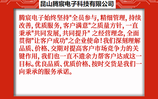 昆山騰宸電子科技有限公司位于中國線路板加工之都昆山千燈,公司專注于電路板研發(fā)設(shè)計、PCB抄板、元器件采購、SMT貼片加工、組裝測試,為客戶提供一站式電子制造服務(wù)。騰宸電子始終堅(jiān)持"全員參與,精細(xì)管理,持續(xù)改善,優(yōu)質(zhì)服務(wù),客戶滿意"之質(zhì)量方針,一直秉承"共同發(fā)展,共同提升" 之經(jīng)營理念,全面貫徹"讓客戶成功"之企業(yè)使命!我們深刻理解品質(zhì)、價格、交期對提高客戶市場競爭力的關(guān)鍵作用,我們也一直不遺余力幫客戶達(dá)成這一目標(biāo)。優(yōu)良品質(zhì)、優(yōu)質(zhì)價格、按時交貨是我們一向秉承的服務(wù)承諾。 ...